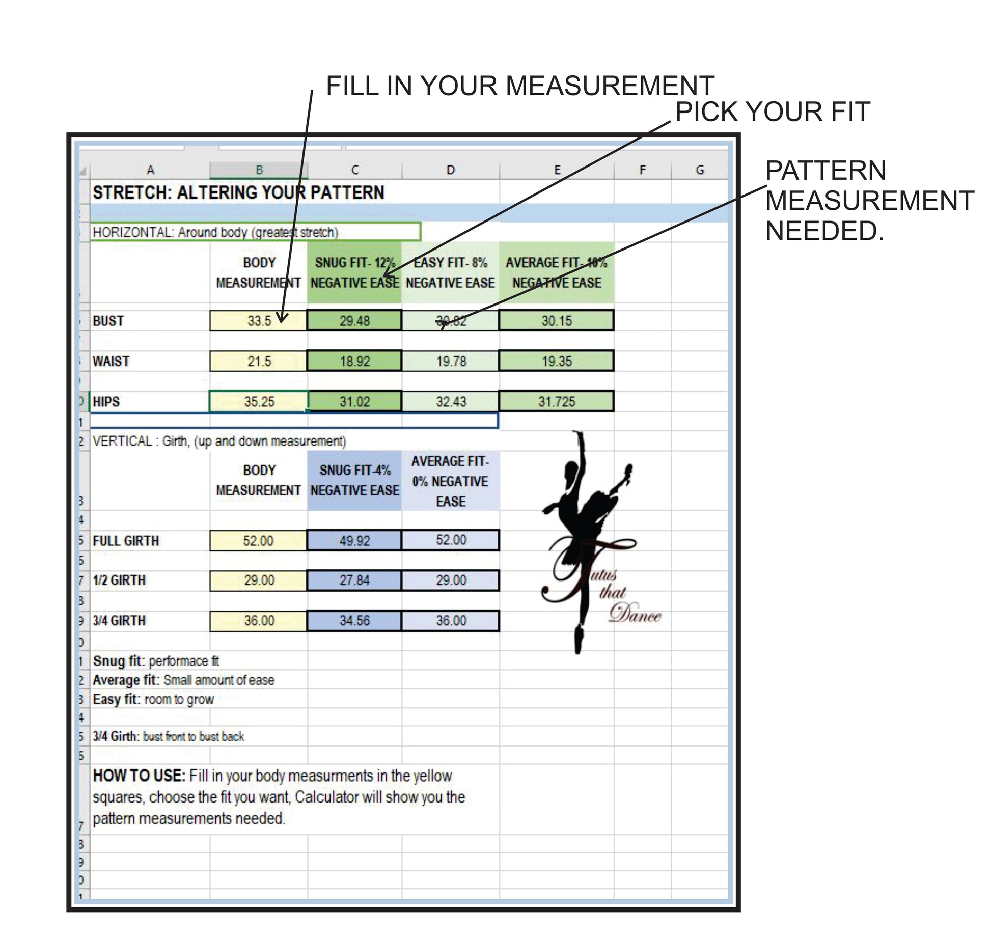 - Add your body measurements in the yellow squares, and calculator will show you the pattern measurement you need with the negative ease required.
